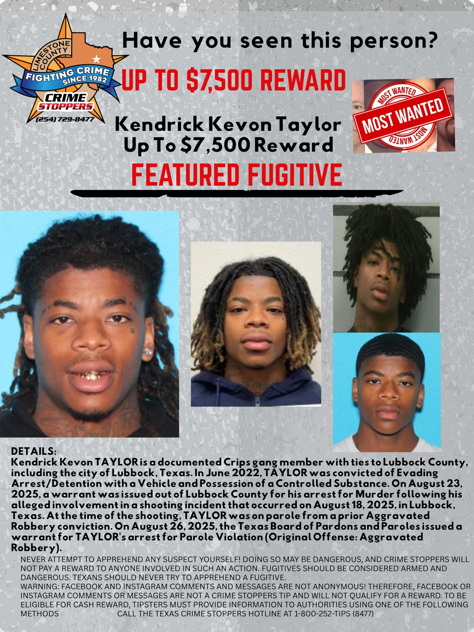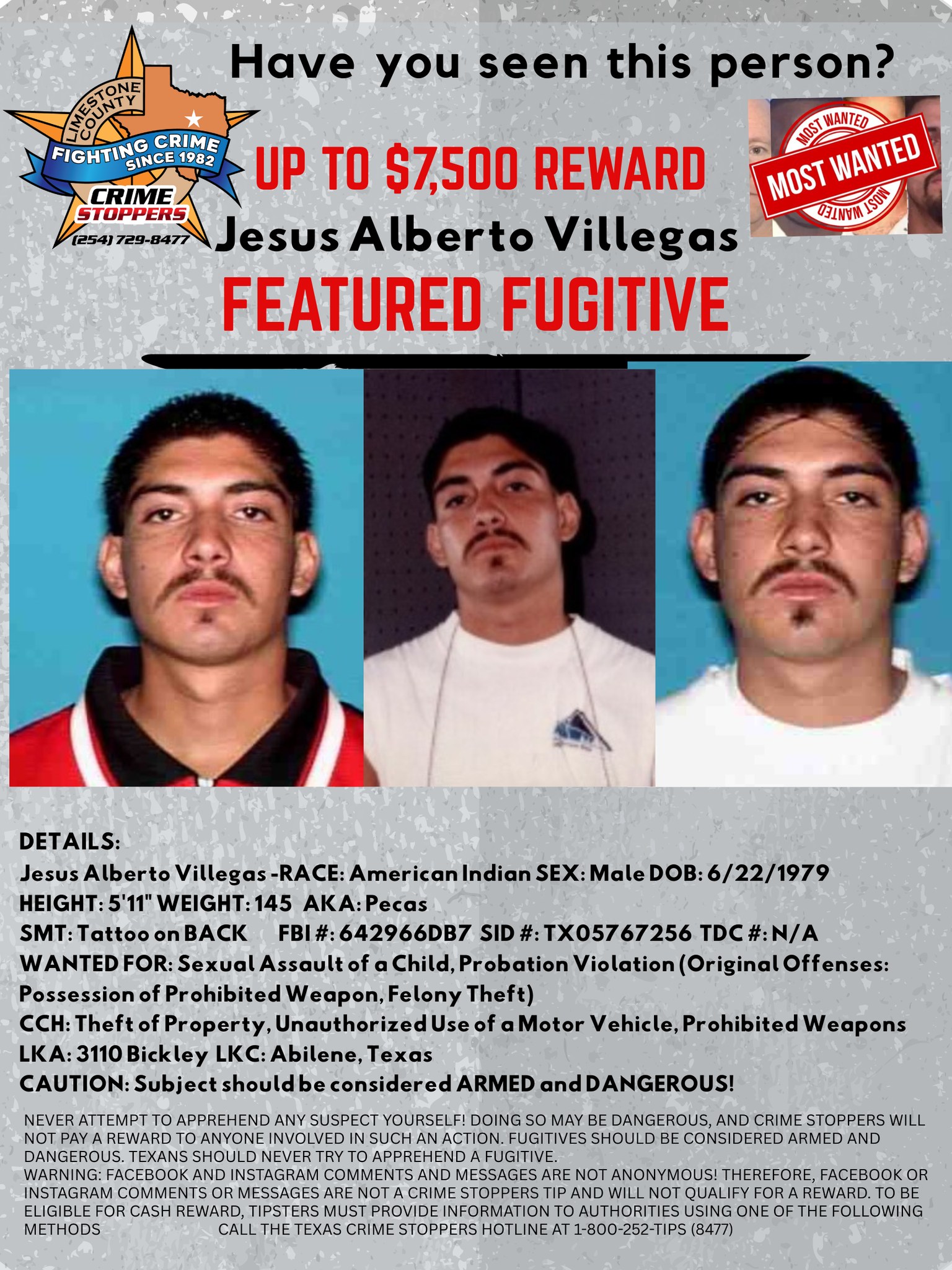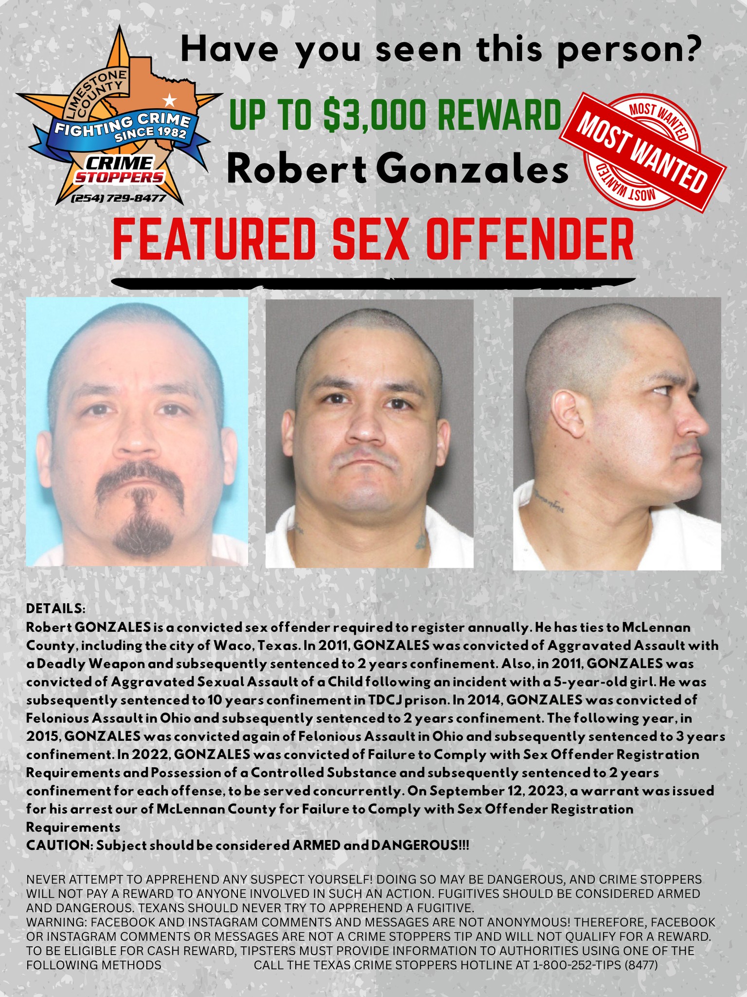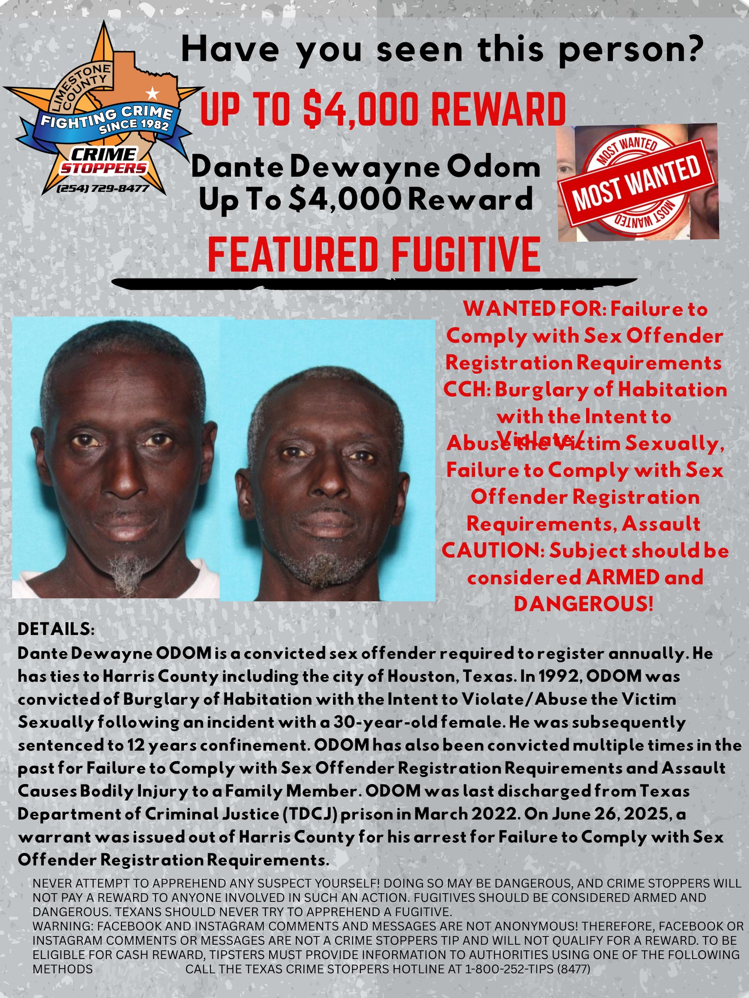 NEVER attempt to apprehend any suspect yourself! Doing so may be dangerous, and Crime Stoppers will not pay a reward to anyone involved in such an action. Fugitives should be considered armed and dangerous. Texans should never try to apprehend a fugitive.