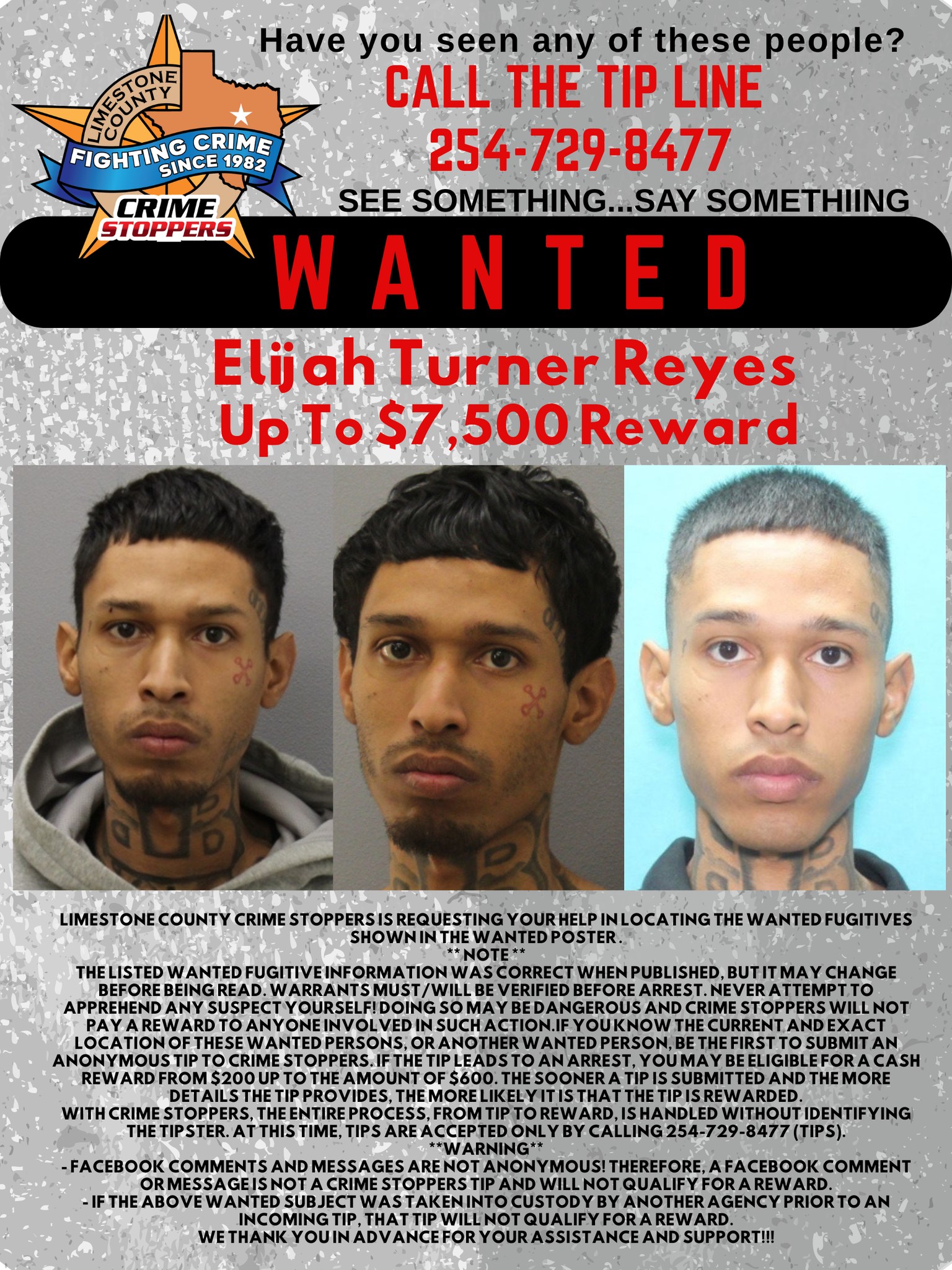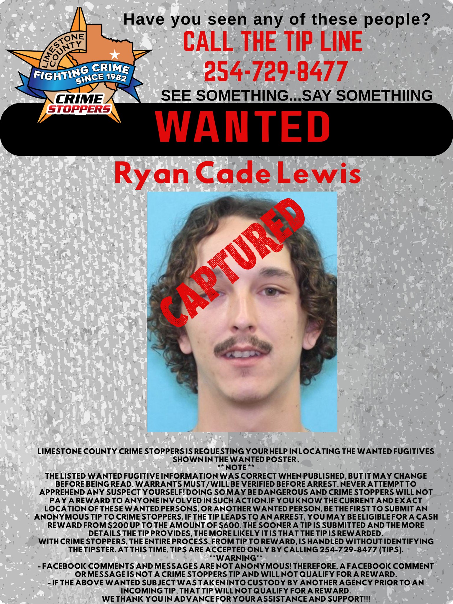 Do you have information about a wanted subject, theft, or drug activity? Call Limestone County Crime Stoppers. If the tip leads to an arrest, you may be eligible for a cash reward from $200 - $1,000+. The sooner a tip is submitted and the more details the tip provides, the more likely it is that the tip is rewarded.