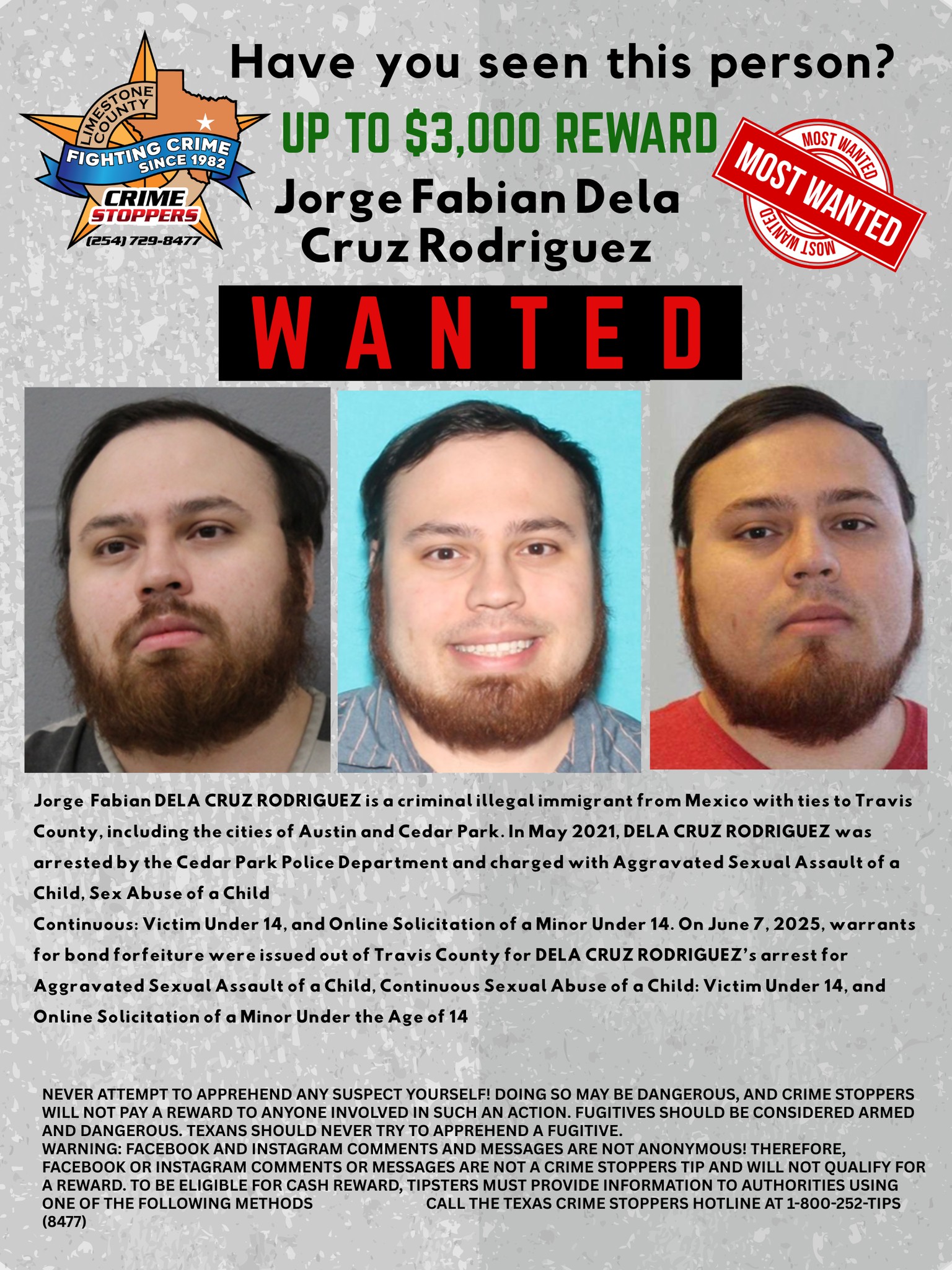 NEVER attempt to apprehend any suspect yourself! Doing so may be dangerous, and Crime Stoppers will not pay a reward to anyone involved in such an action. Fugitives should be considered armed and dangerous. Texans should never try to apprehend a fugitive.