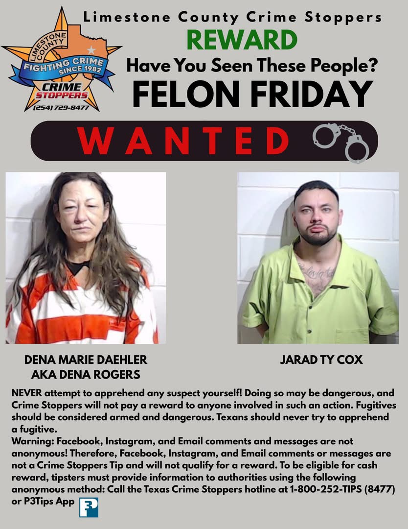 Do you have information about a wanted subject, theft, or drug activity? Call Limestone County Crime Stoppers. If the tip leads to an arrest, you may be eligible for a cash reward from $200 - $1,000+. The sooner a tip is submitted and the more details the tip provides, the more likely it is that the tip is rewarded.
